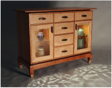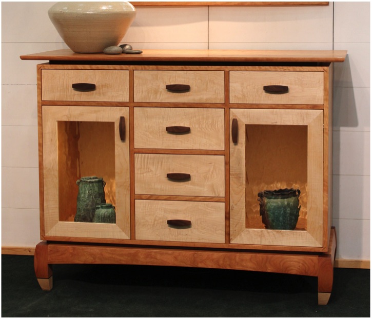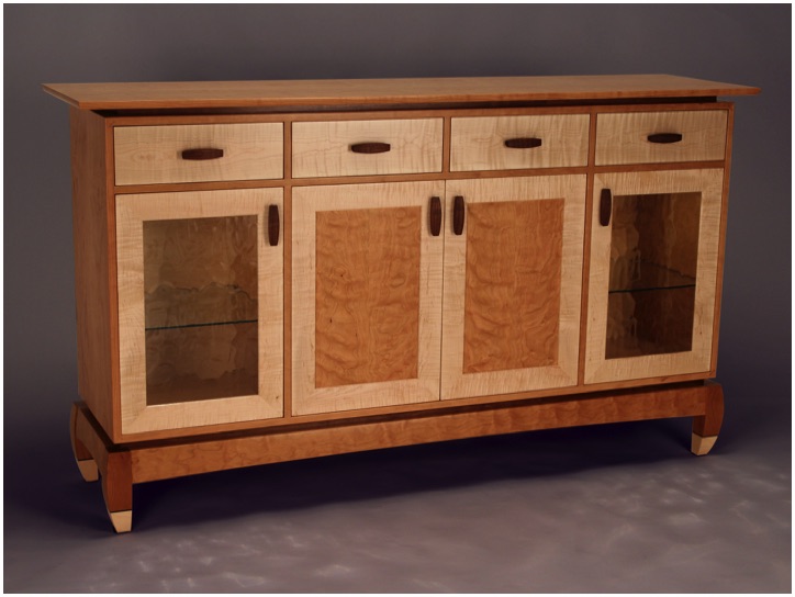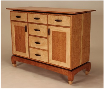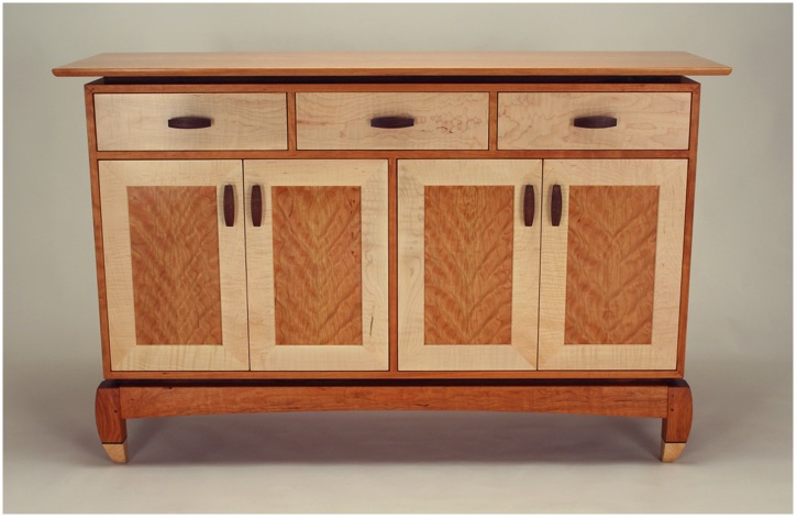 Pictured above with Cherry cabinet body, floating top, and our "stumpy bowed leg" base frame. The Curly Maple feet seen above are optional. Drawers and door frames are Curly Maple with Walnut "PeaPod" handles.