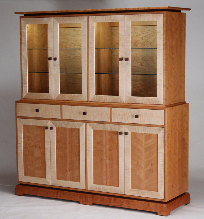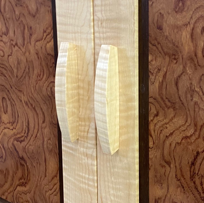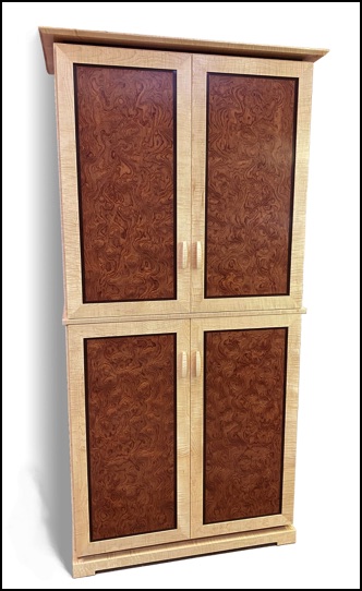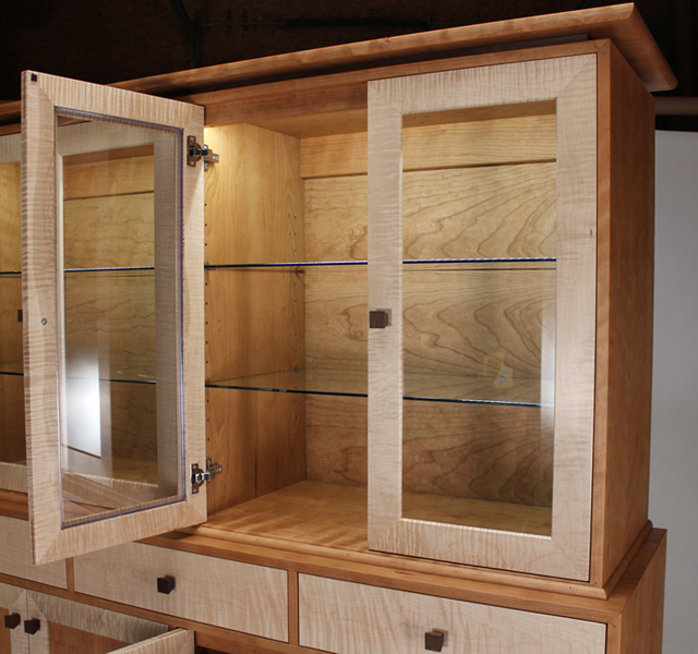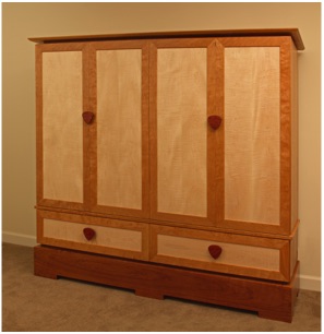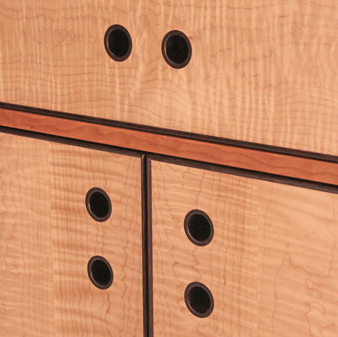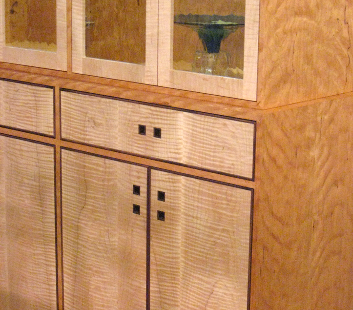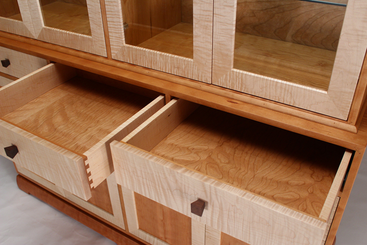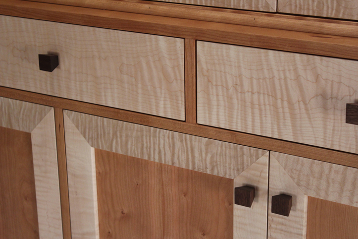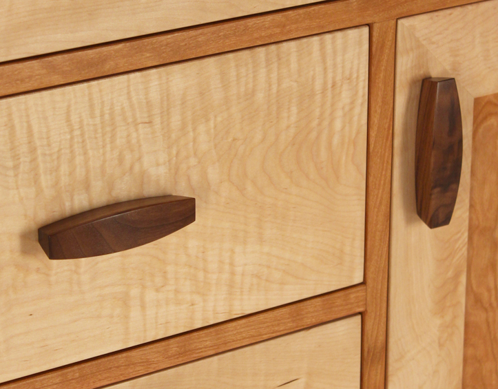 Pictured above with Cherry cabinet body, floating top, door panels, and our "Rounded low profile" base frame. Drawers and door frames are Curly Maple with Walnut handles.