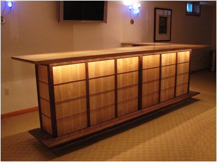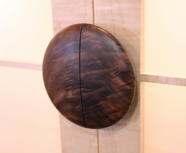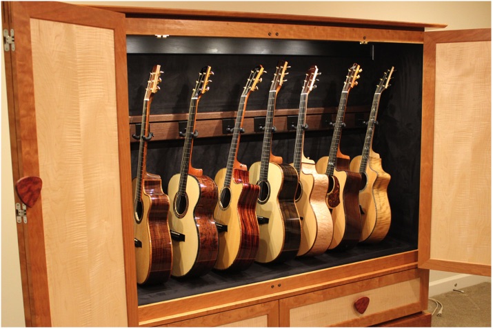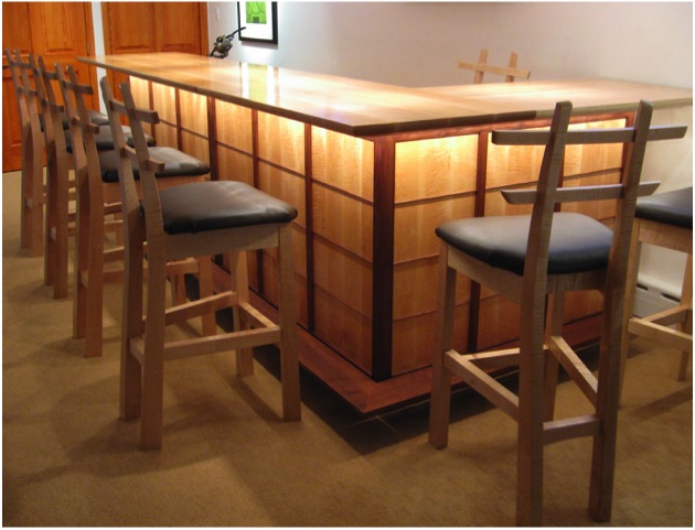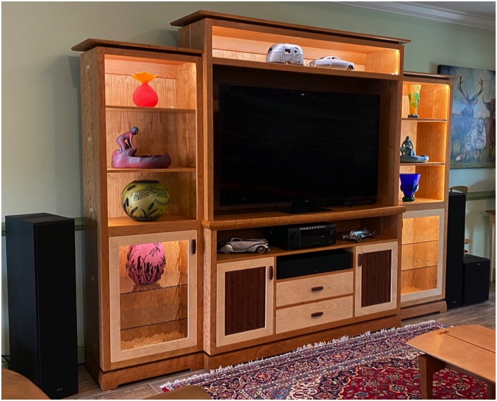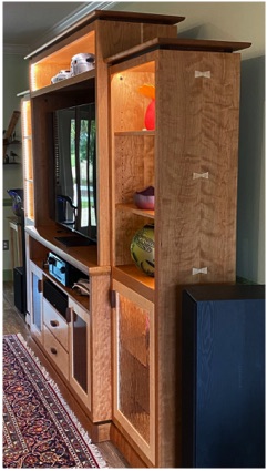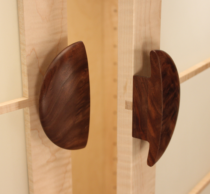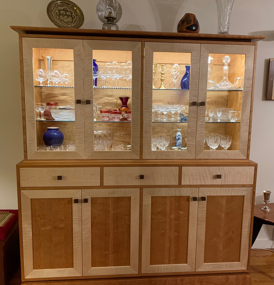 Pictured above with Cherry cabinet body, floating top, door panels, and our "Rounded low profile" base frame. Drawers and door frames are Curly Maple with Walnut handles.