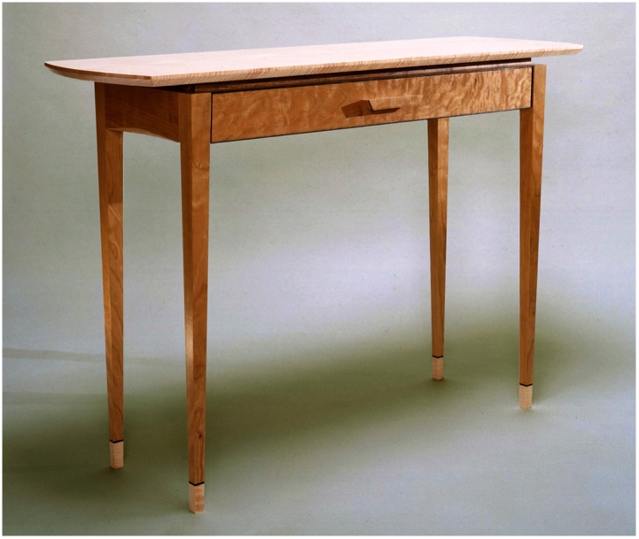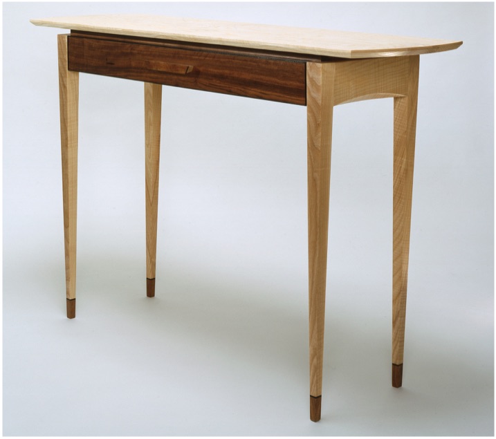 Employing much of the styling from our Torii Table and TT2 Console, the “Hall Table with Drawer” offers the practicality of a wide, shallow drawer for your keys, mail, and the usual odds and ends that need such a convenient home. The drawer front is outlined with raised beadwork of either Walnut or Wenge, and the handle is a dovetail shaped device constructed of three woods to echo the color combination of the feet and legs. Drawer bodies are made of solid Maple with dovetailed corners and hardwood drawer slides.
