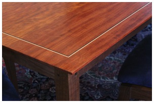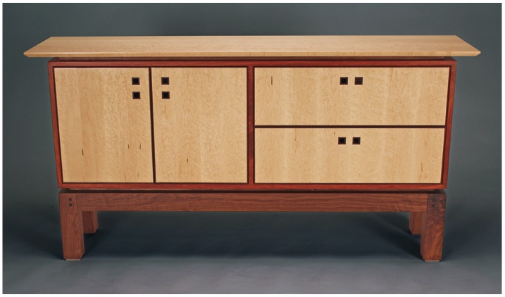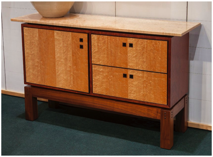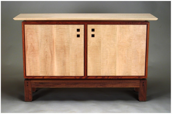 Matched Bird’s Eye Maple or Curly Maple top, door & drawers with Wenge beadwork trim. Bubinga cabinet body, Walnut “tall leg” base.