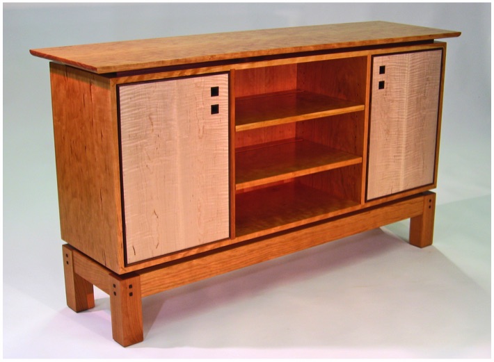 Pictured above with bookmatched Curly Maple doors with Wenge beadwork trim and square "Fingles" (small finger sized handles). Figured Cherry cabinet body, floating top, and “tall leg” base.