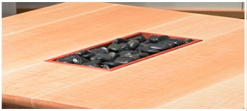 In my design, I wanted to preserve the function of friends and family coming together and sharing food and drink. Hence, our Kotatsu/Tea Table comes with three interchangeable inserts. The black pebble stones (included) are a symbolic reference to the charcoal, while the other two inserts serve as interchangeable trivet and cutting board. The latter two are finished with food safe, butcherblock oil, so like any wood cutting board or salad bowl you have in your kitchen, these can be hand washed in the sink and re-oiled as often as needed.