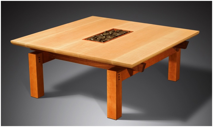 The inspiration for our Japanese Tea Table is a traditional table called a Kotatsu which appeared in many older Japanese homes that had no central heating system. The Kotatsu had a charcoal hibachi grill in the middle of it, and was often recessed into a hole cut in the floor. A social gathering spot, family and friends would sit around the Kotatsu and share food and drink, a specially made blanket draped over their legs to keep the heat in.
