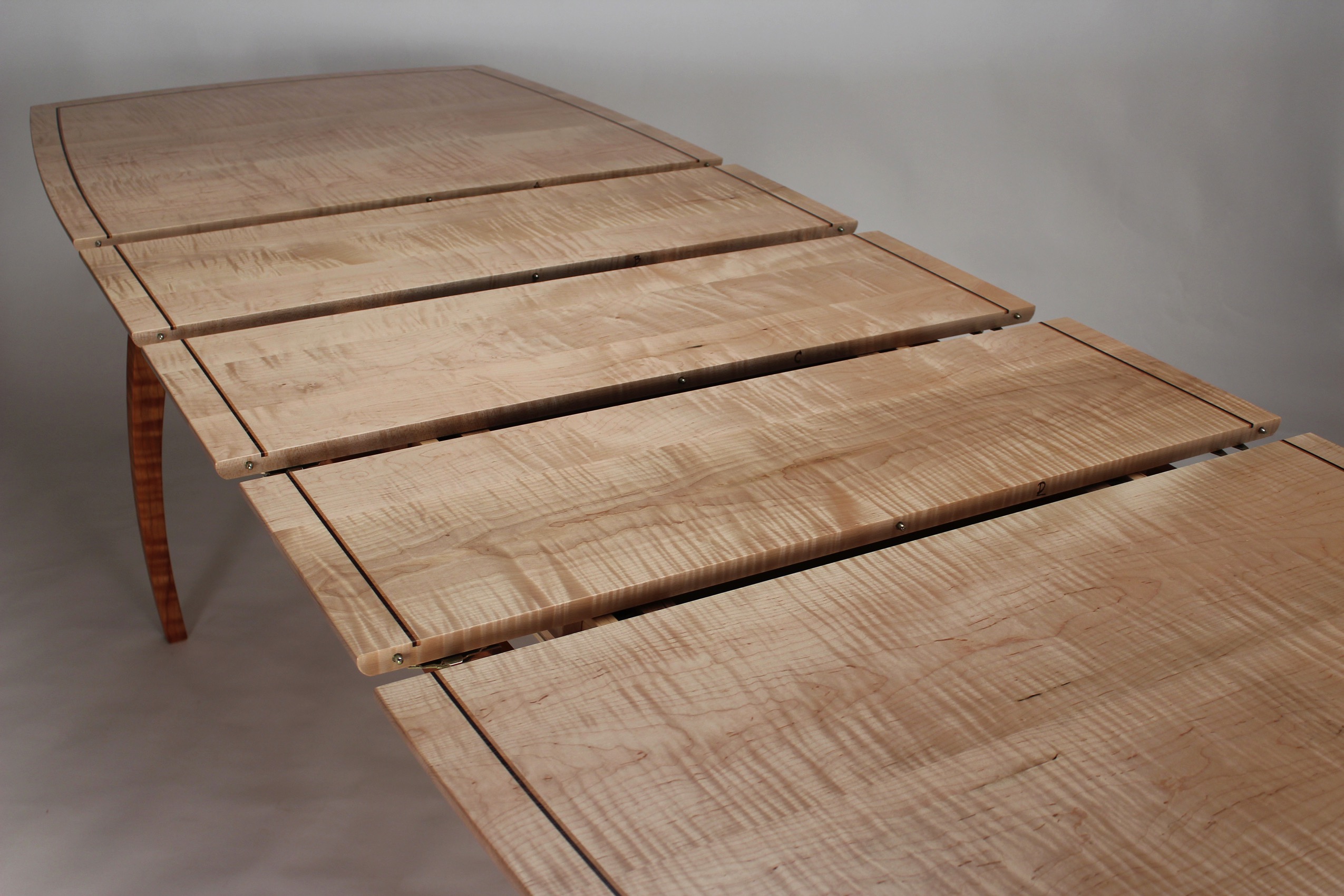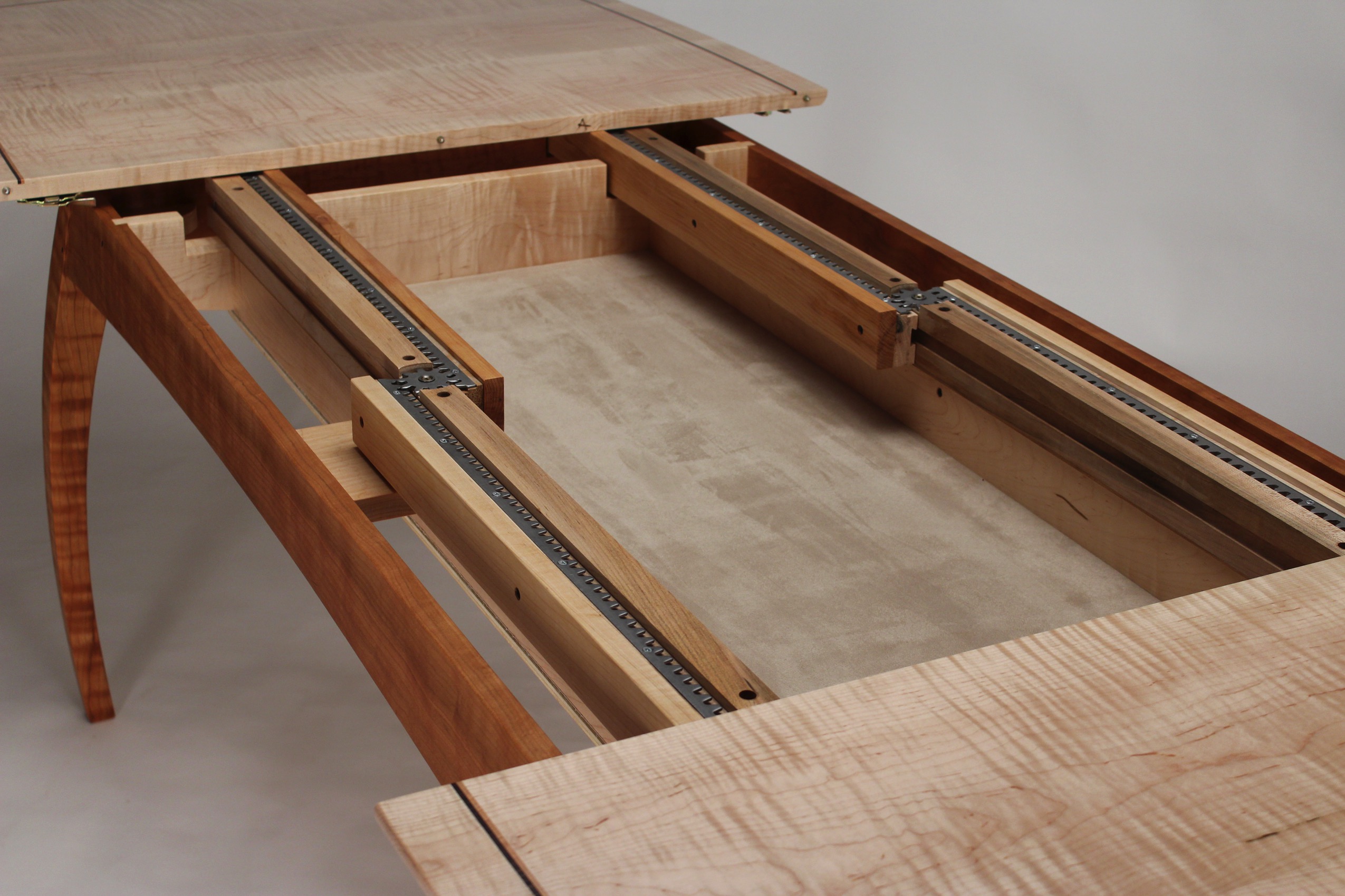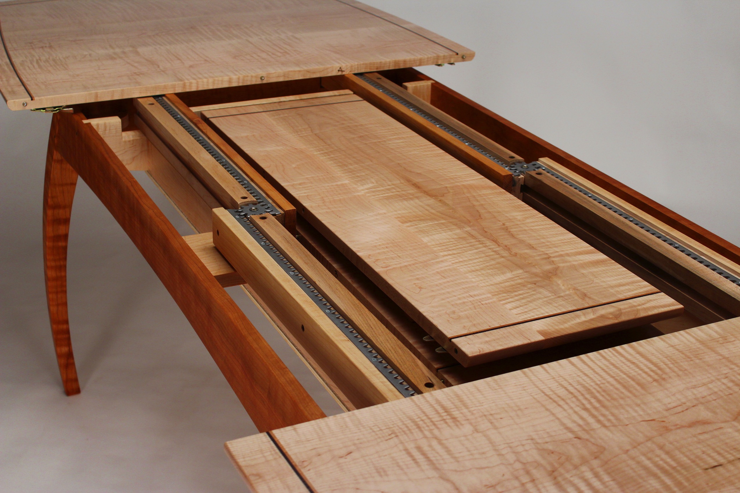 The leaves are aligned flush and held tightly together with the main top sections with swiveling toggle locks along at each seam. Available in a variety of natural solid woods: Curly Maple, Cherry, Walnut, Bubinga.