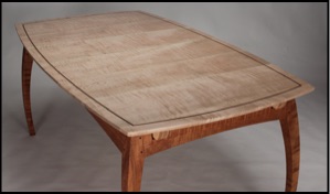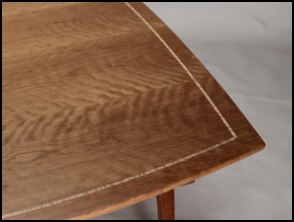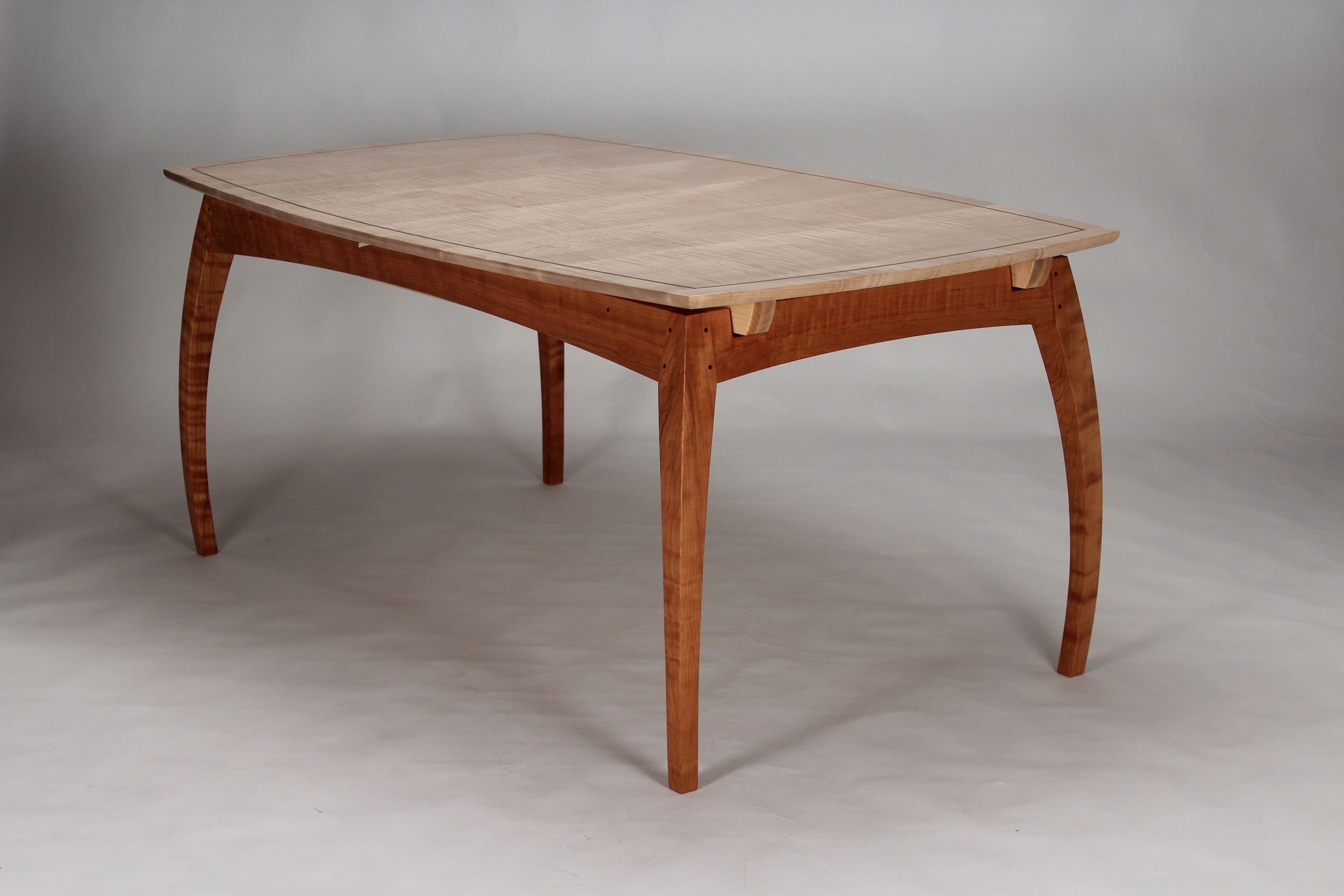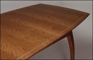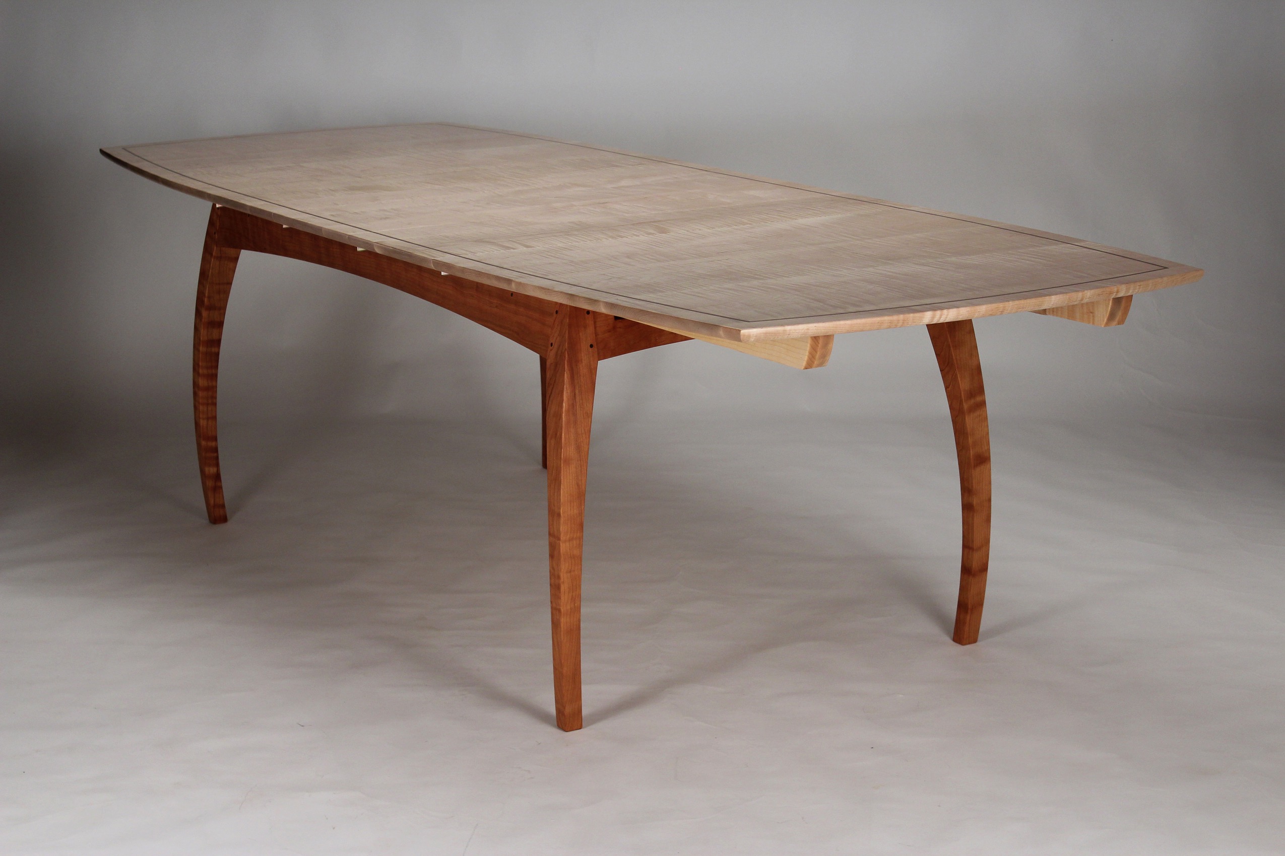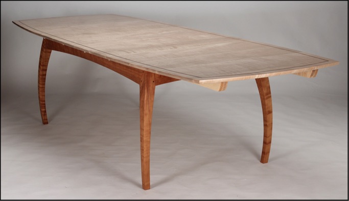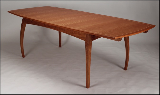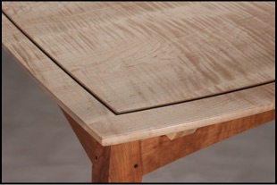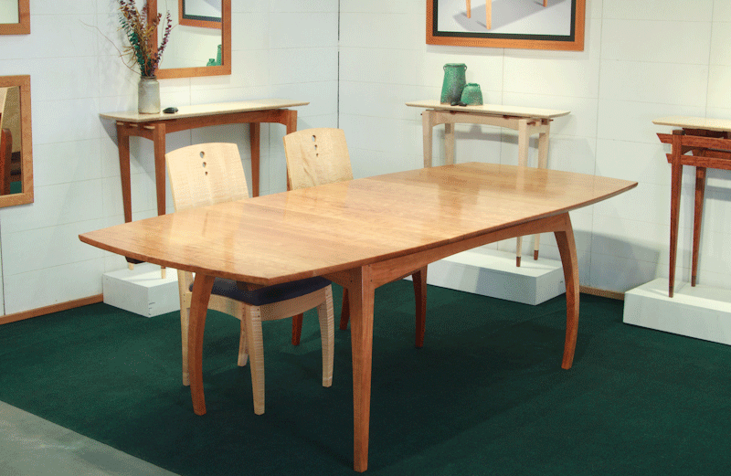 The leaves are aligned flush and held tightly together with the main top sections with swiveling toggle locks along at each seam. Available in a variety of natural solid woods: Curly Maple, Cherry, Walnut, Bubinga.