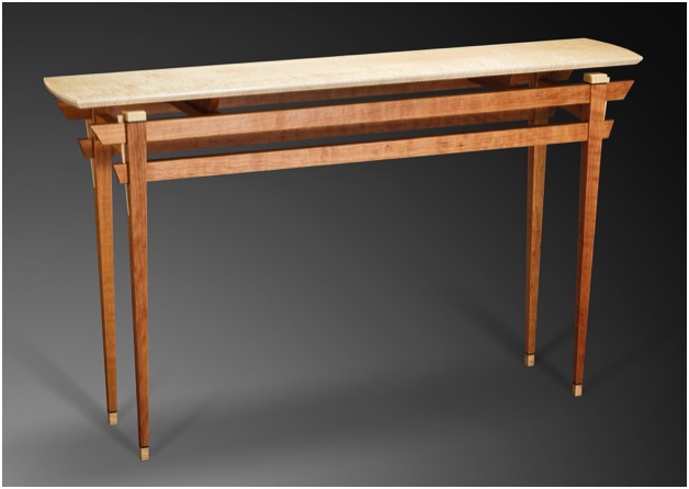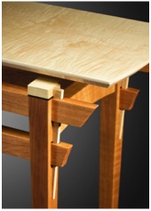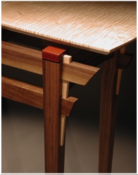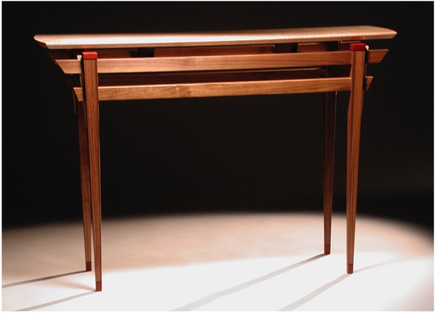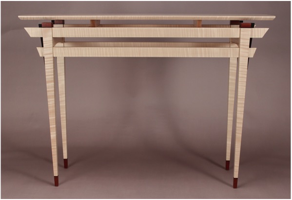 Inspired by the iconic Torii Gates, our Torii Table is made using authentic Japanese joinery, and comes ready-to-assemble in a flat box. (instructions are easy to follow. No tools needed) For a touch of intrigue, the floating top appears to hover above contrasting leg caps of either bloodwood, bubinga or more curly maple, which are set off by a sliver of Wenge. Makes a great compliment with either our Windswept or Torii Mirror below.
