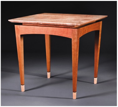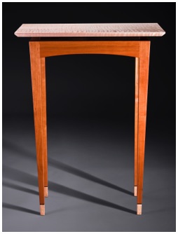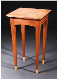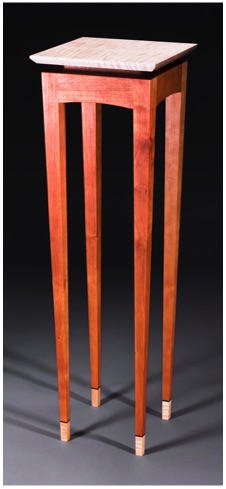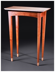 These fine tables come in a variety of sizes, configurations, and color schemes to accommodate many needs and uses. Whether it be a hall table, sculpture pedestal, plant stand, or a side table for bed or sofa, we’re sure you’ll be impressed with the balance between their light, airy, elegant styling and their sturdy, solid, built for “everyday use” construction. The long tapered legs and other base parts are made from durable North American hardwoods such as Walnut, Cherry, or Curly Maple. The floating tops are usually made from beautiful Curly Maple and are finished with waterproof, alcohol proof, clear, Catalyzed lacquer. Contrasting color feet are made of similar hardwoods, and appear to make the table dance across the floor on it’s toes.